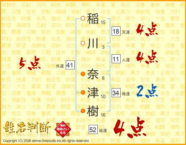 稲(15画)川(3画) 奈(8画)津(10画)樹(16画)