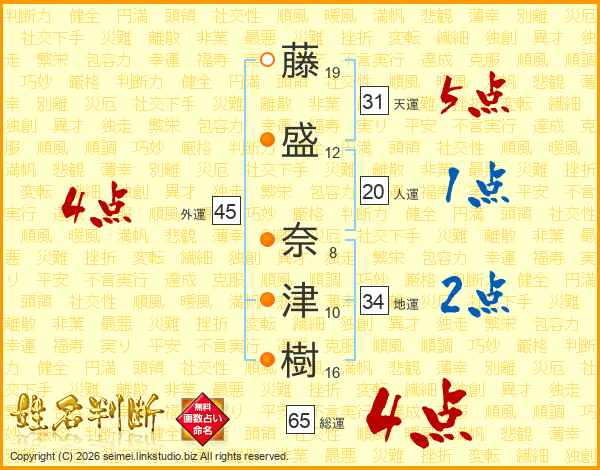 藤(19画)盛(12画) 奈(8画)津(10画)樹(16画)