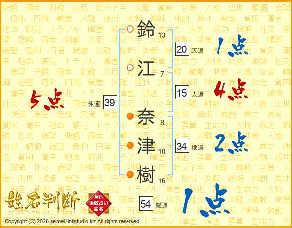 鈴(13画)江(7画) 奈(8画)津(10画)樹(16画)