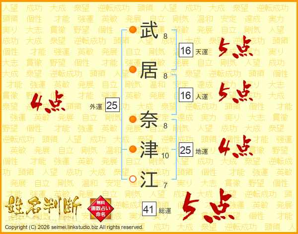 武(8画)居(8画) 奈(8画)津(10画)江(7画)