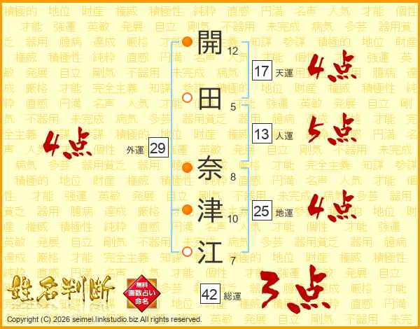 開(12画)田(5画) 奈(8画)津(10画)江(7画)