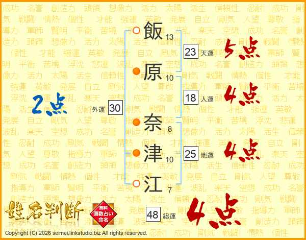 飯(13画)原(10画) 奈(8画)津(10画)江(7画)