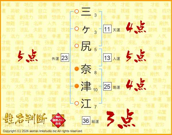 三(3画)ヶ(3画)尻(5画) 奈(8画)津(10画)江(7画)