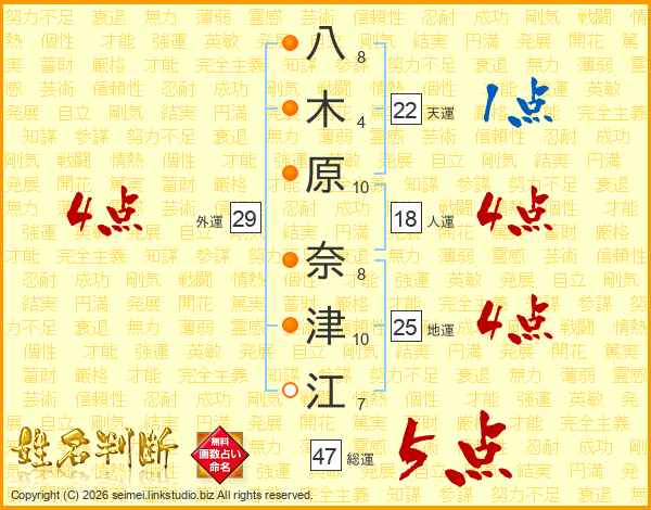 八(8画)木(4画)原(10画) 奈(8画)津(10画)江(7画)