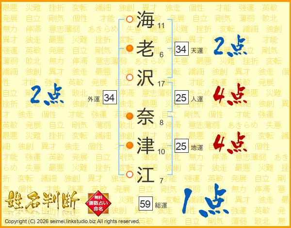 海(11画)老(6画)沢(17画) 奈(8画)津(10画)江(7画)