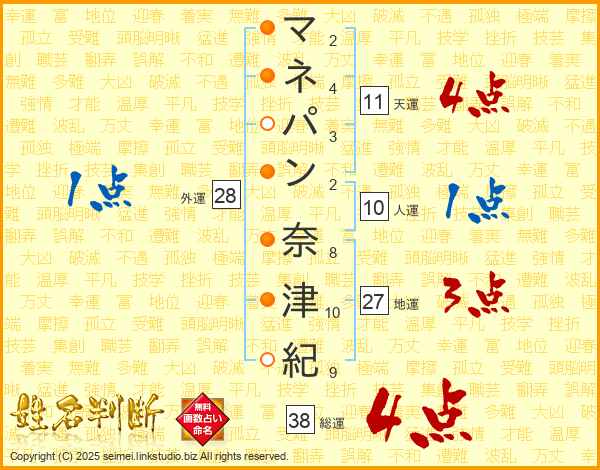 マ(2画)ネ(4画)パ(3画)ン(2画) 奈(8画)津(10画)紀(9画)