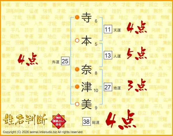 寺(6画)本(5画) 奈(8画)津(10画)美(9画)
