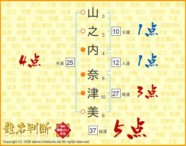 山(3画)之(3画)内(4画) 奈(8画)津(10画)美(9画)