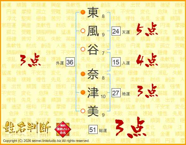 東(8画)風(9画)谷(7画) 奈(8画)津(10画)美(9画)