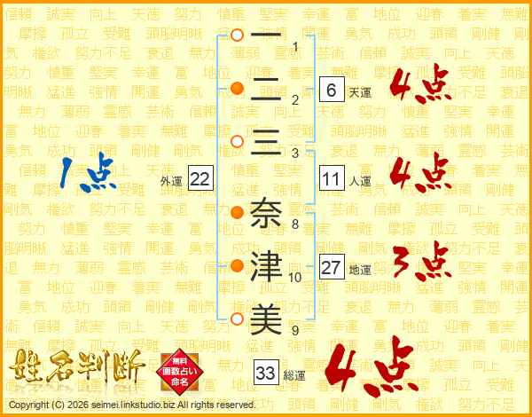 一(1画)二(2画)三(3画) 奈(8画)津(10画)美(9画)
