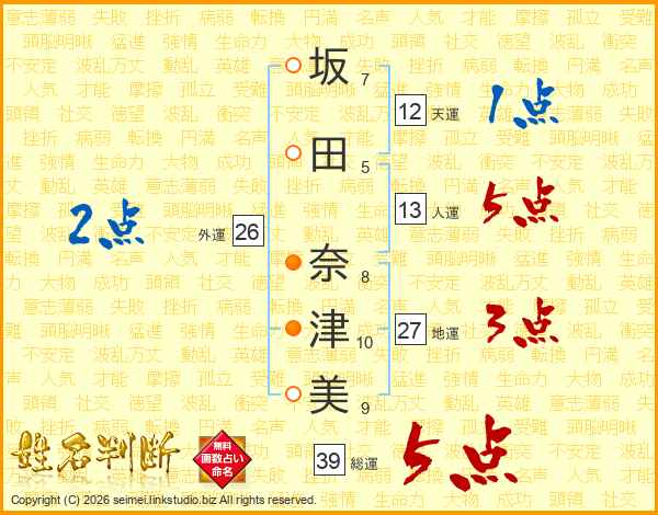 坂(7画)田(5画) 奈(8画)津(10画)美(9画)