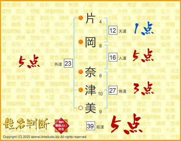 片(4画)岡(8画) 奈(8画)津(10画)美(9画)