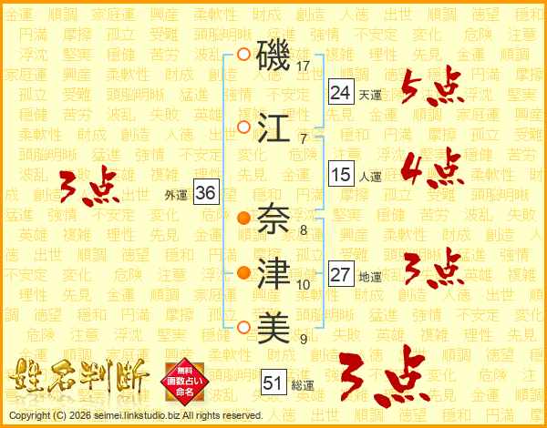磯(17画)江(7画) 奈(8画)津(10画)美(9画)