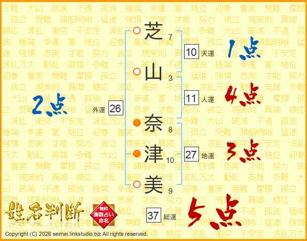 芝(7画)山(3画) 奈(8画)津(10画)美(9画)