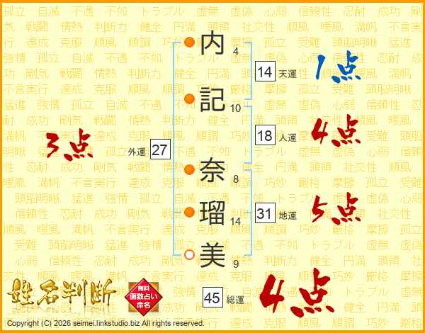 内(4画)記(10画) 奈(8画)瑠(14画)美(9画)