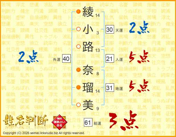 綾小路奈瑠美さんの総運は61画の3点!