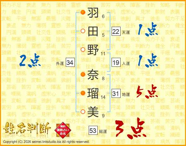 羽田野奈瑠美さんの総運は53画の3点!