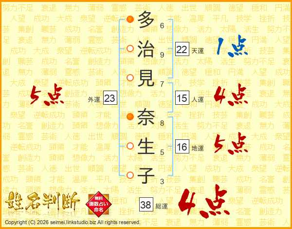 多(6画)治(9画)見(7画) 奈(8画)生(5画)子(3画)