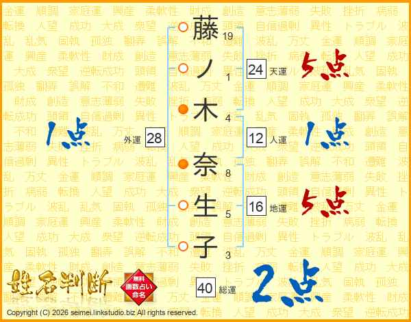 藤(19画)ノ(1画)木(4画) 奈(8画)生(5画)子(3画)