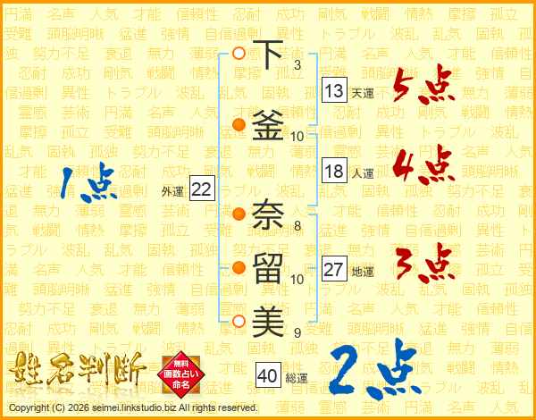 下(3画)釜(10画) 奈(8画)留(10画)美(9画)