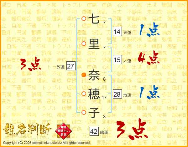 七(7画)里(7画) 奈(8画)穂(17画)子(3画)