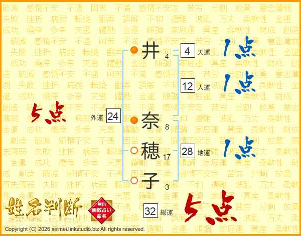 生活面を象徴する運勢です。外部から受ける影響力を表し、結婚運、家庭運や職場、環境への順応性を表します。総運から人運を引いた画数。姓や名が1文字の場合を除く。