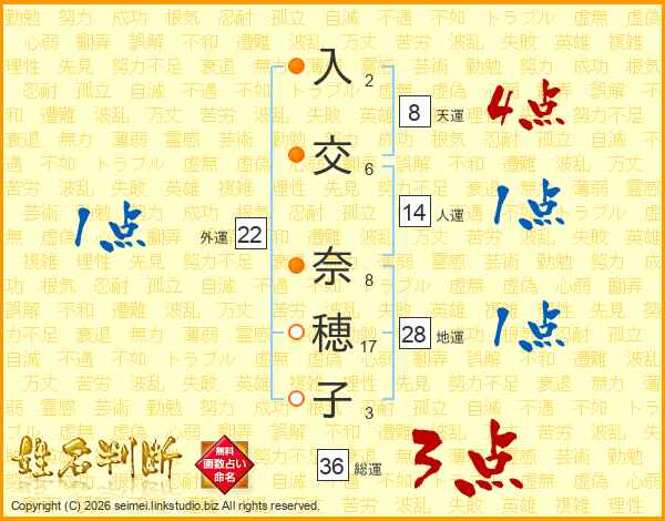 入(2画)交(6画) 奈(8画)穂(17画)子(3画)
