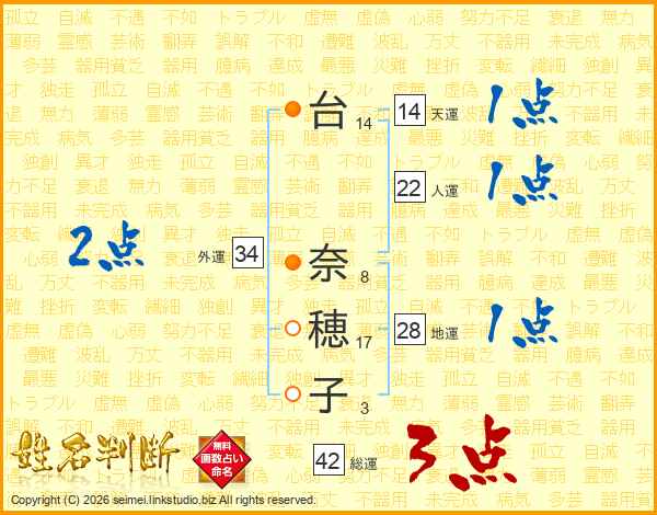 生活面を象徴する運勢です。外部から受ける影響力を表し、結婚運、家庭運や職場、環境への順応性を表します。総運から人運を引いた画数。姓や名が1文字の場合を除く。