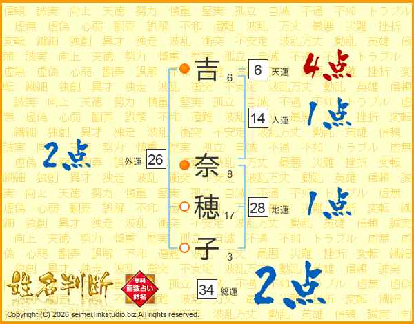 吉(6画) 奈(8画)穂(17画)子(3画)