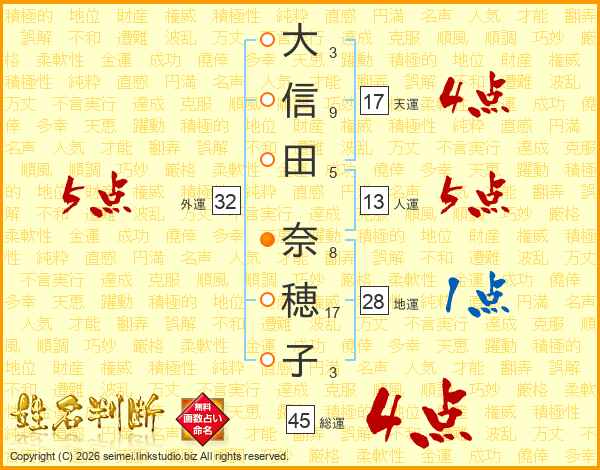 大(3画)信(9画)田(5画) 奈(8画)穂(17画)子(3画)