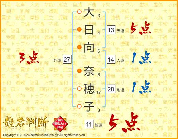 大(3画)日(4画)向(6画) 奈(8画)穂(17画)子(3画)