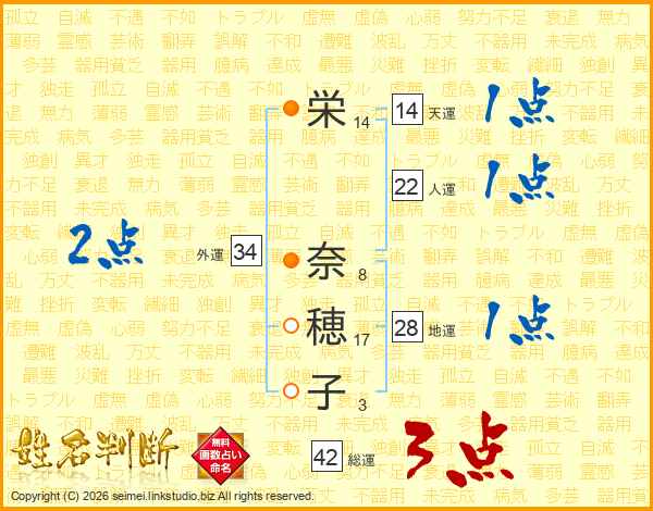 栄(14画) 奈(8画)穂(17画)子(3画)