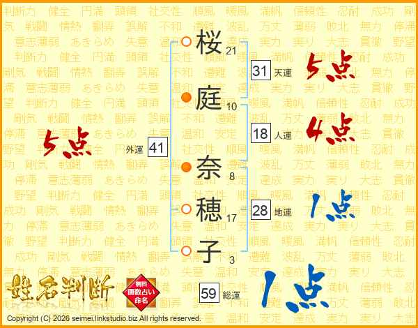 桜(21画)庭(10画) 奈(8画)穂(17画)子(3画)