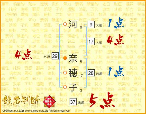 河(9画) 奈(8画)穂(17画)子(3画)
