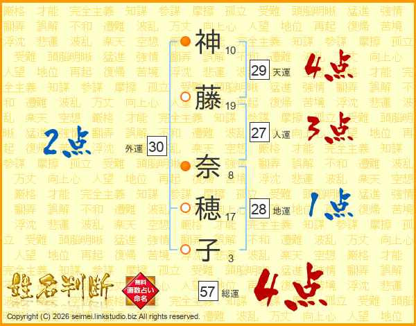 神(10画)藤(19画) 奈(8画)穂(17画)子(3画)