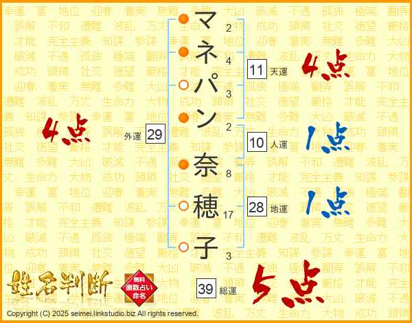 マ(2画)ネ(4画)パ(3画)ン(2画)  奈(8画)穂(17画)子(3画)