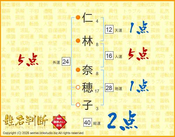 仁(4画)林(8画) 奈(8画)穂(17画)子(3画)