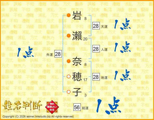 岩(8画)瀨(20画) 奈(8画)穂(17画)子(3画)