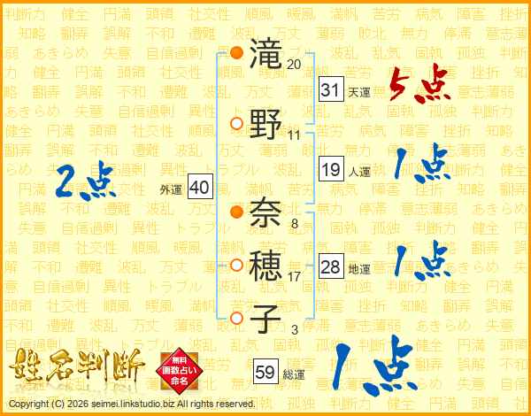 滝(20画)野(11画) 奈(8画)穂(17画)子(3画)