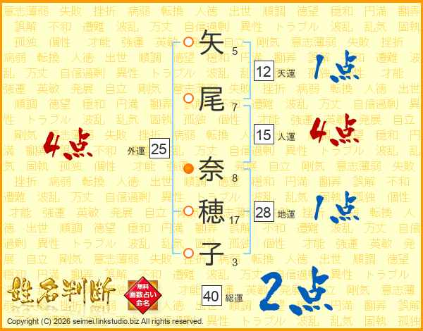 矢(5画)尾(7画) 奈(8画)穂(17画)子(3画)