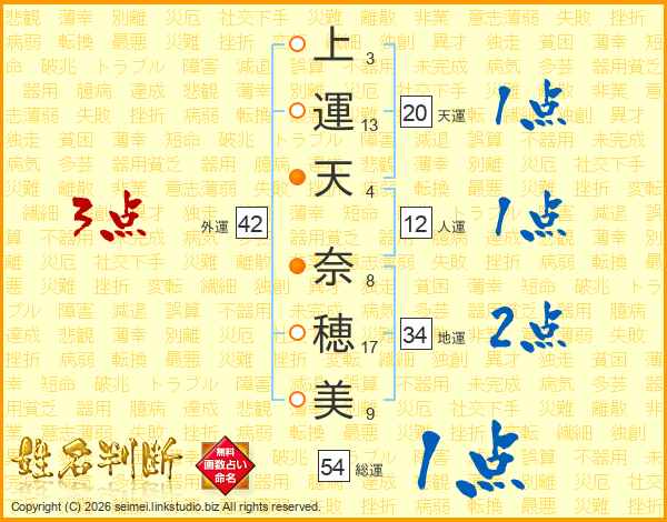 上運天奈穂美さんの外運は42画の3点!