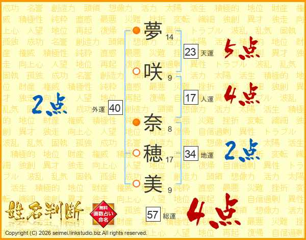 夢(14画)咲(9画) 奈(8画)穂(17画)美(9画)