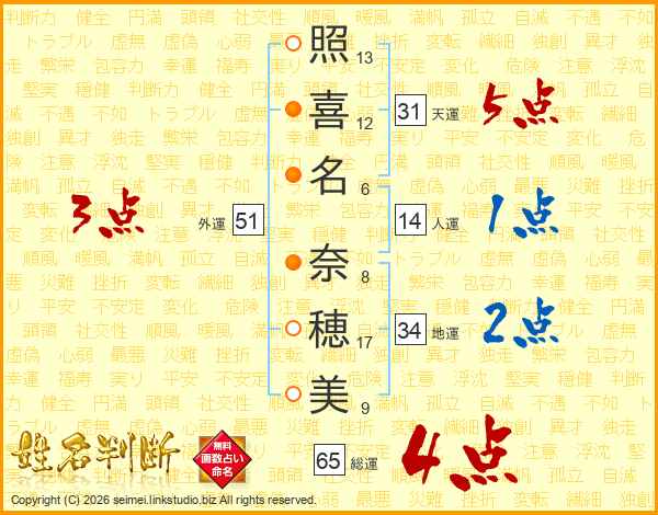 照(13画)喜(12画)名(6画) 奈(8画)穂(17画)美(9画)