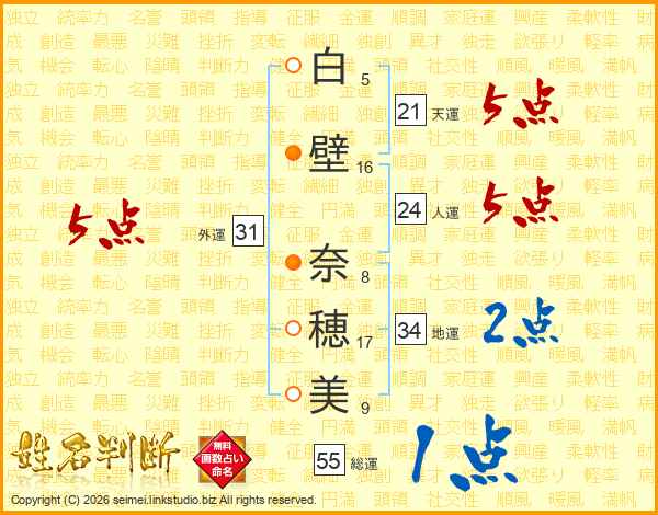 白(5画)壁(16画) 奈(8画)穂(17画)美(9画)