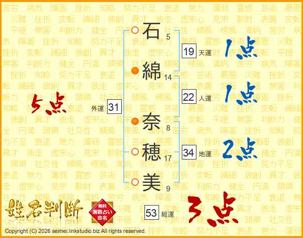 石(5画)綿(14画) 奈(8画)穂(17画)美(9画)