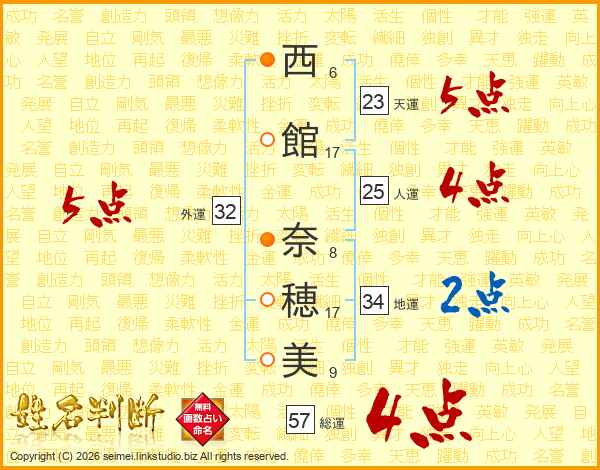 西(6画)館(17画) 奈(8画)穂(17画)美(9画)