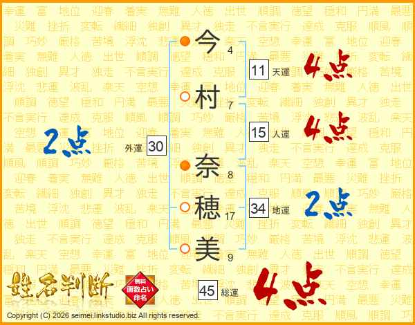 今(4画)村(7画) 奈(8画)穂(17画)美(9画)