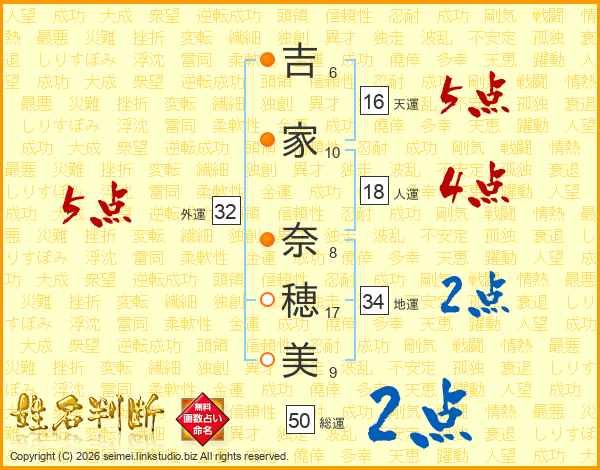 吉(6画)家(10画) 奈(8画)穂(17画)美(9画)