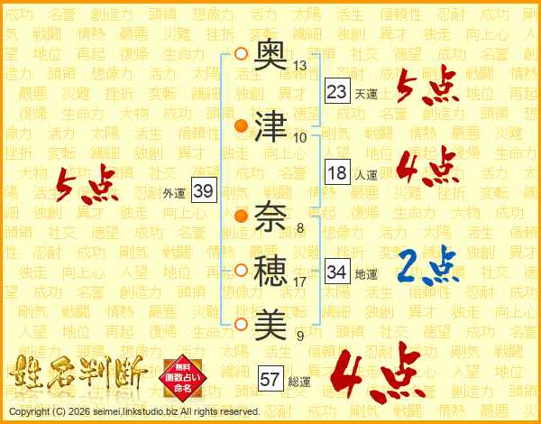奥津奈穂美さんの総運は57画の4点!