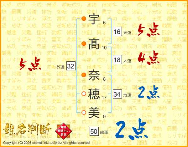 宇(6画)髙(10画) 奈(8画)穂(17画)美(9画)